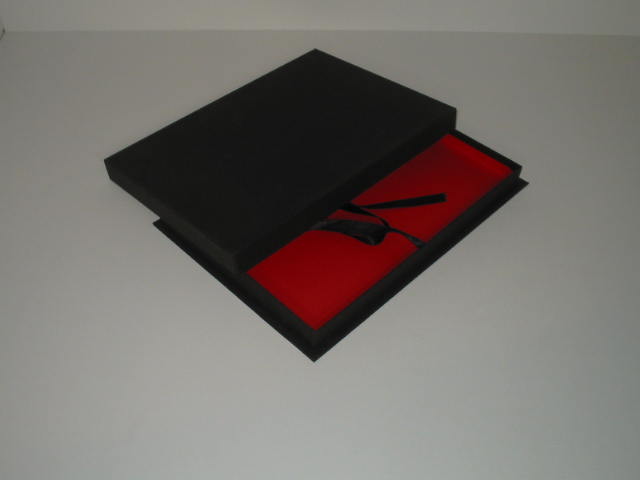 底板付の印籠タイプ貼り箱です。リボンは内部の商品を固定する為に使用します。高価な出版物などを装丁する目的で製造しました。極小ロットでの製造も対応できます。ダンボール箱・折畳み箱にはない風格があります。